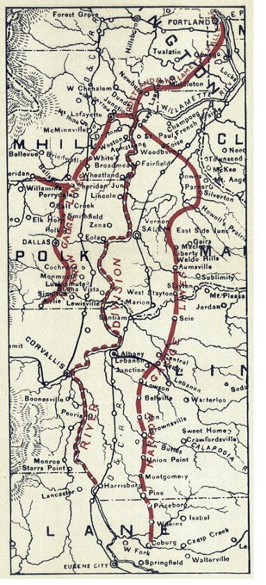 Forty years ago the Willamette Valley was eager for railroads, just as now for automobile highways. The navigable river which drains the valley was an easy avenue of transportation, but wagon roads leading to the river were difficult, and, in much of the productive area, were impassable in winter and impossible in summer. Two lines of railroad reached southward from Portland, the one forty-eight miles to Saint Joseph, on Yamhill River, the other, two hundred miles to Roseburg, in the valley of Umpqua River. Wagon road approaches to these steel highways were difficult, like those to the river. In short, agricultural growth was held back by poor means of hauling to market. The best remedy then known was construction of iron railroads. And the cheapest railroad to build and operate was the narrow-gauge.