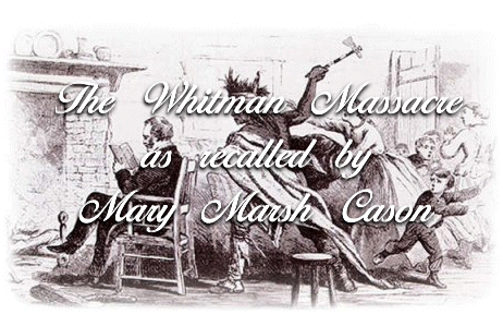 the Willamette Valley. He got employment from the Doctor. It was on the 29th of November, about 2 o'clock in the afternoon that the Indians broke out and murdered the Doctor and Mrs. Whitman and eight others. Six families were living in adobe (unk.) not far from the doctor's house. Father and I occupied an upper-room, where we cooked our meals and slept. He had come in and had his dinner, his last dinner, and had gone to work - attending the grist mill. That was the last time that I ever say my poor dear father. I was washing the dishes when I heard the report of a gun. It was the gun that killed Gillion, the tailor. He was doing some sewing of some kind when an Indian stood in the door and shot him. At the same time the horrible work was going on outside. I and some others went upstairs where we could look from a window and see a part of the conflict near the Doctor's house. Three or four men were butchering a beef there. I saw them engaged with quite a number of Indians. Mr. Kimball was dealing hard with several, he having an axe to fight with. He fought desperately for awhile but they killed him at last. I saw Mr. Hall chased by an Indian with an uplifed tomahawk (the Indian on a horse) but Mr. Hall made his escape. Meanwhile Mrs. Whitman had barred the doors and windows to keep them out of the house - but they broke in anyway. I saw them break into the house, led by Joe Lewis, the instigator of the trouble. There they finished their bloody work for that day. Mr. Sails and Beverly were sick and were not killed that day. A week later they were killed on their beds. Afterwards, I saw Beverly laying outside the house with his head almost torn from his body. He laid there all night. All of the dead bodies were buried in one grave by the four men who were not killed - Elam Young, his two sons and Mr. Smith. When the Indians killed the two sick men I was so freightened I ran to an Indian for protection - one who claimed to be friendly. After the horrible work was done there were nearly 50 widows and orphans in captivity - expecting any time to share the same fate of the others, but we were spared - only to endure the fear, suspense and cruel treatment that an Indian is capable of inflicting. For one month the prisoners were kept well guarded and made to work. One old fellow put me to knitting for him a pair of long - legged socks. I got one nearly made when Governor Ogden of the Hudson Bay Company came to our relief and bought us from the heathens and took us away. We went in wagons to Fort Wallila (?). The first day there we were put in batteaux and started down the river. The batteaux were open boats with canvas to spread over the top to keep the rain out. Whenever a head showed up the Governor would holler, "duck that head." I, for one, suffered with the cold and I suppose the others did too, for we were so scant of clothing. When we reached The Dalles the volunteers were there. My brother was one of them as he had gone on down to the Valley in the fall. We journeyed on down the Columbia and up the Willamette River to Oregon City. There we were turned loose with thankful hearts that we had escaped the merciless foe. Most of the children had their mothers but I was entirely alone among strangers. My brother being with the volunteers, so I was left to the charity of the people. You know how an orphan would fare among perfect strangers. They are soon not wanted any longer. In 1849 my brother went to California, but before he left he found me a home with Mrs. A.L. Lovejoy who was very careful of my welfare. There I remained until I was married to James P. Cason, son of F.C. Cason, who crossed the plains in '43. When we arrived at Oregon City a lady gave me a piece of bread and mollasses. I did enjoy it for bread was not very plentiful those days. There was plenty of salmon and sometimes boiled wheat for a change. I do not know how many of the survivors of that massacre are living that are as old as I am. I have a picture of Doctor Whitman's buildings and of the neglected grave in which he and the others are buried." Mrs. Mary C. Marsh Cason |